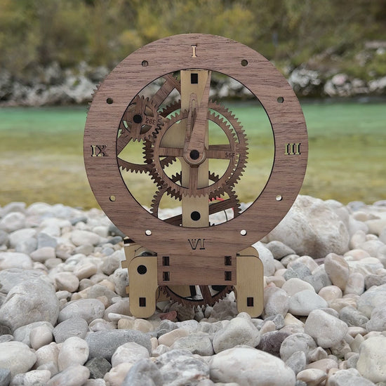 To je praktična izkušnja — del sestavljanka, del umetnost, del inženiring. Sestavi jo, postavi na ogled in uživaj ob opazovanju časa, ki teče skozi vsako zobato kolo.
